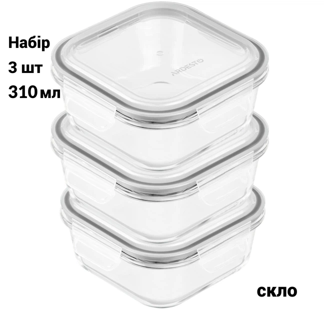 Набір контейнерів для зберігання скляних 3 шт Ardesto Gemini термостійкі квадрат 310 мл AR1230BSQ
