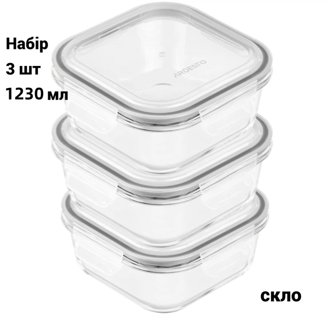 Набір контейнерів для зберігання скляних 3 шт Ardesto Gemini термостійкі квадрат 1230 мл AR1212BSQ