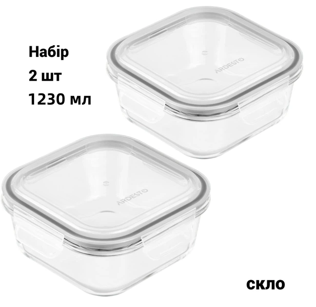 Набір контейнерів для зберігання скляних 2 шт Ardesto Gemini термостійкі квадрат 1230 мл AR1212BSQ