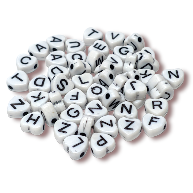 Намистини пластикові у формі серця з чорними літерами англійського алфавіту 7х4 мм 25 г +-188 шт Білий (БП0704с01)