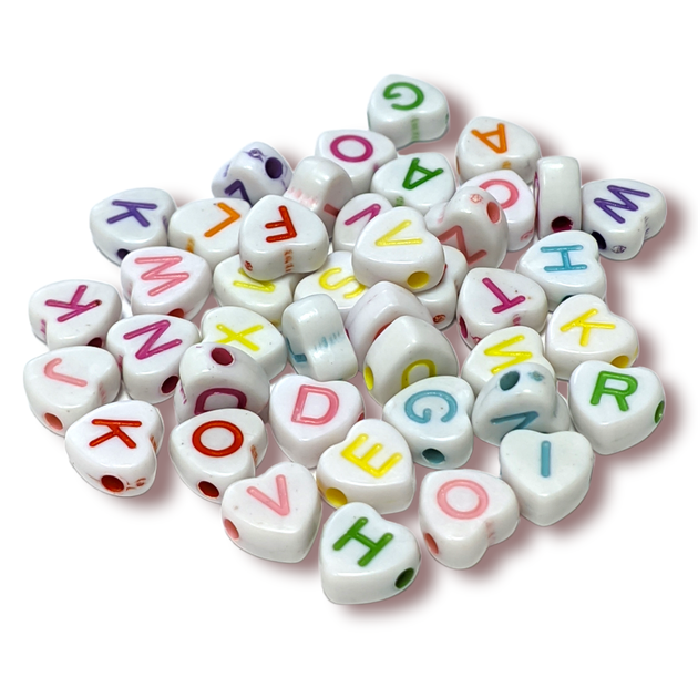 Намистини пластикові у формі серця з різнокольоровими літерами англійського алфавіту 7х4 мм 25 г +-188 шт Білий (БП0704с50)