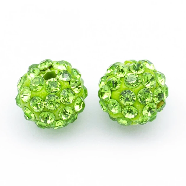 Бусини Шамбала зі стразами, Клас А, з Полімерної Гліни, Круглі, Перидот, 8 мм, Отвірі 1.5 мм, 2 шт.