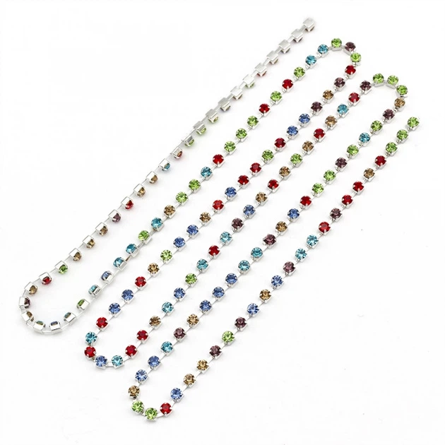 Ланцюг зі Стразами, Латунь, Клас А, Срібло, Стрази Різнокольорові, Ширина 2мм, близько 360шт/1.1м