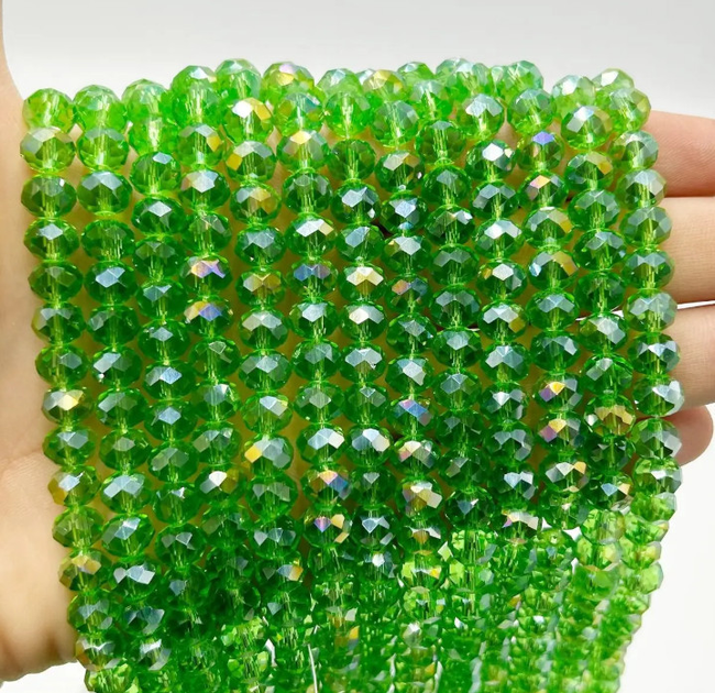 Намистини кришталеві "ронделі" 8х6 мм зелений прозорий з АВ (65-70 шт)