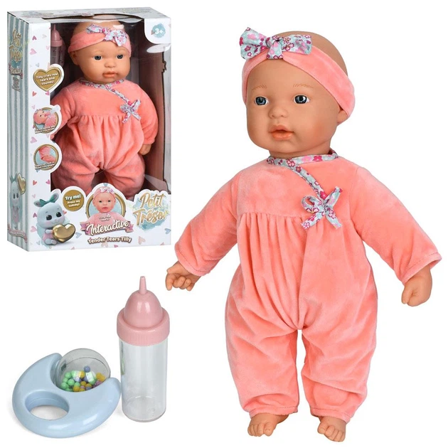 Лялька-пупс м’яконабивна, інтерактивна, плаче зі сльозами, пляшечка, брязкальце, музика, батарейки (16390)