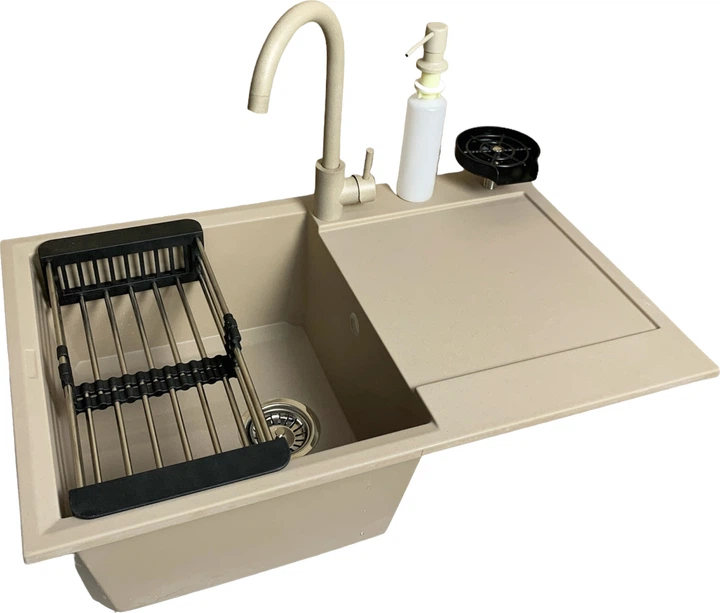 Кухонна мийка граніт ADAMANT Horizon Medium Avena з сифоном + кухонний змішувач + дозатор + ополіскувач склянок + коландер