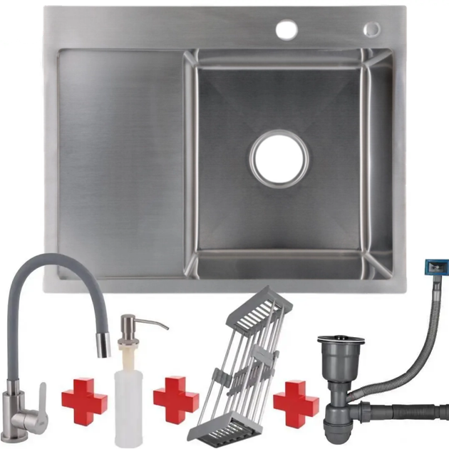 Мийка для кухні інтегрована крило зліва Brushed (комплект) Lidz Handmade H6350L зі змішувачем, дозатором та кошиком