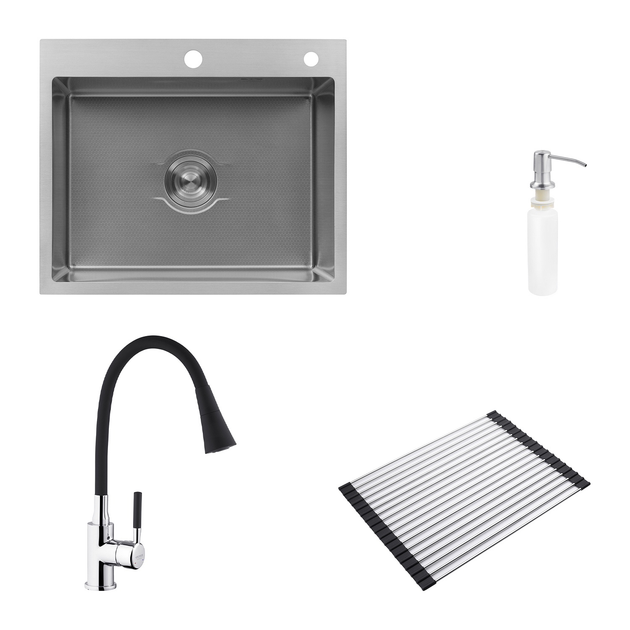 Комплект кухонна мийка Kroner Derby-6050HM Brush + cушарка для посуду Kroner Matte-SCH4333-2 + змішувач Kuche-C132BLK + доза