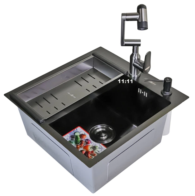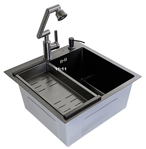 Мийка з нержавіючої сталі AQUAMILL 5050 с PVD покриттям чорна + змішувач-трансформер + дозатор + решітка