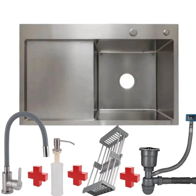 Набір 3 в 1 мийка для кухні із двома чашами інтегрована Lidz Handmade H7843 + Змішувач для кухні Lidz Vida 015F3 + дозатор S