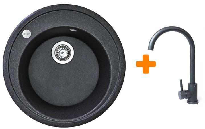 Кухонна мийка граніт ADAMANT Sun чорна з сифоном Nova + кухонний змішувач та дозатор