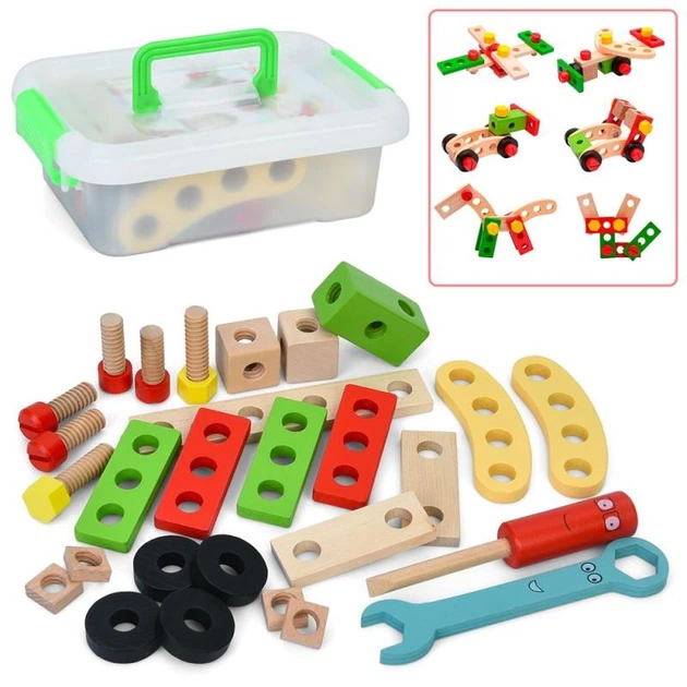 Дерев'яна іграшка Конструктор MD 1977 на шурупах транспорт інструменти пластиковий ящик 20-15-7 см.