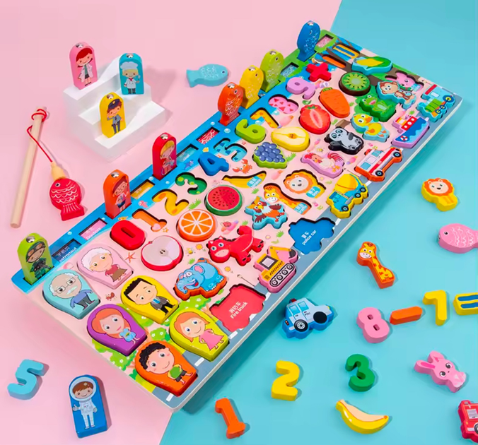 Дерев'яний магнітний сортер-пазл для дітей 3в1 з цифрами, фруктами, тваринами та вудочкою (4518 см)