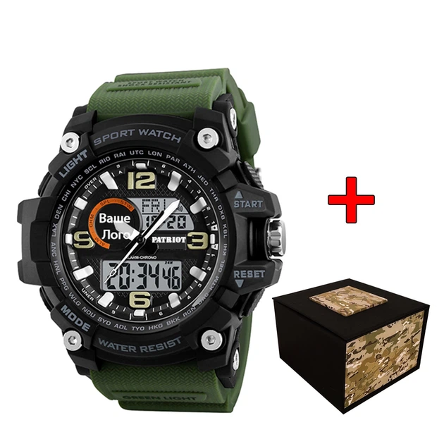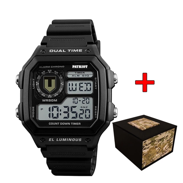 Наручний годинник Patriot чорний з хакі для чоловіків спортивний електронний з підсвічуванням і ремінцем з каучуку коробка в