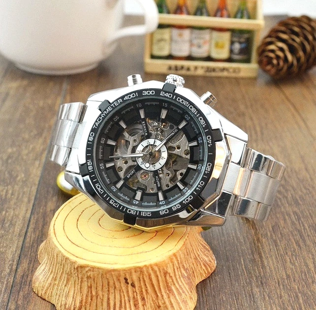 Чоловічий механічний годинник Winner чорний сталевий аналоговий годинник для чоловіків стрілочний механіка (513296)