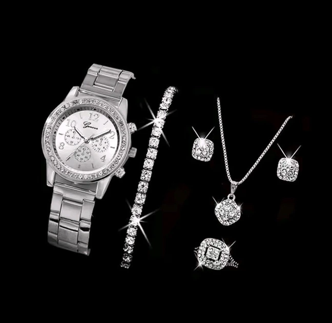 Жіночий годинник Geneva прикрашений стразами + набір прикрас (Maxr-100710)