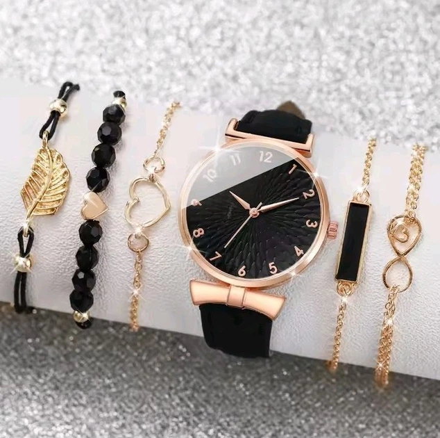 Жіночий годинник Geneva з ремінцем з екошкіри + набір прикрас (Чорний) (Maxr-00688)