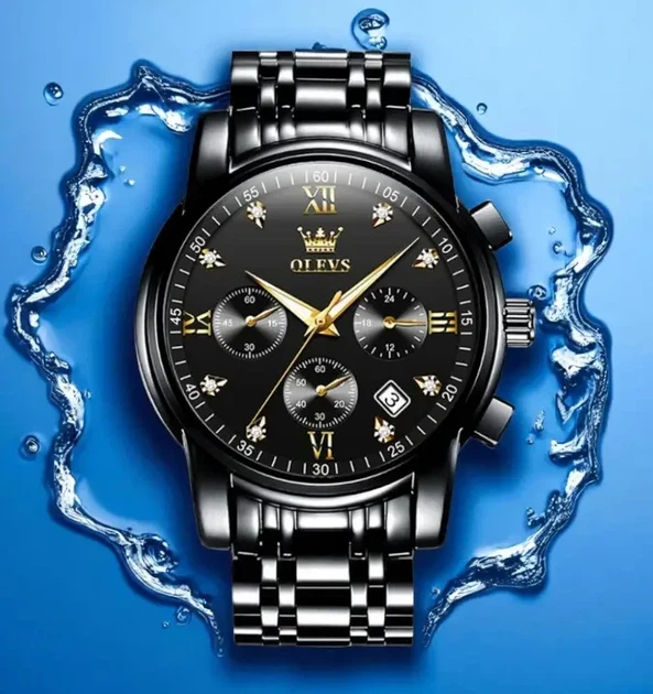 Чоловічий годинник Olevs 2858 Black, класичний кварцовий хронограф, преміум дизайн, чорний браслет (ol2858b)
