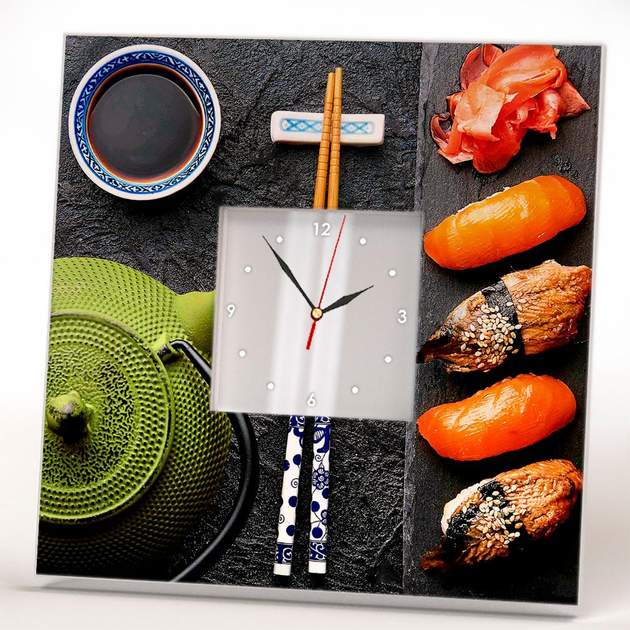 Годинник "Суші і чайник" декор подарунок із зображенням японської їжі, прикраса декор кухні, кафе, бару, ресторану