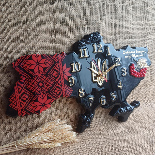 Годинник 40х25 см настінний з епоксидної смоли ручної роботи "Карта України" вишиванка (ЧЕС00000083)