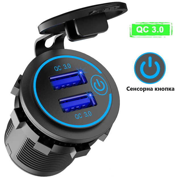 Автомобільна зарядка врізна (вбудована) 2 USB 12-24В, QC 3.0 (швидка зарядка) Синя сенсорна кнопка