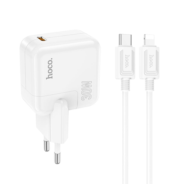Мережевий зарядний пристрій hoco 30W з підтримкою швидкого заряджання PD з кабелем type c на lightning білий