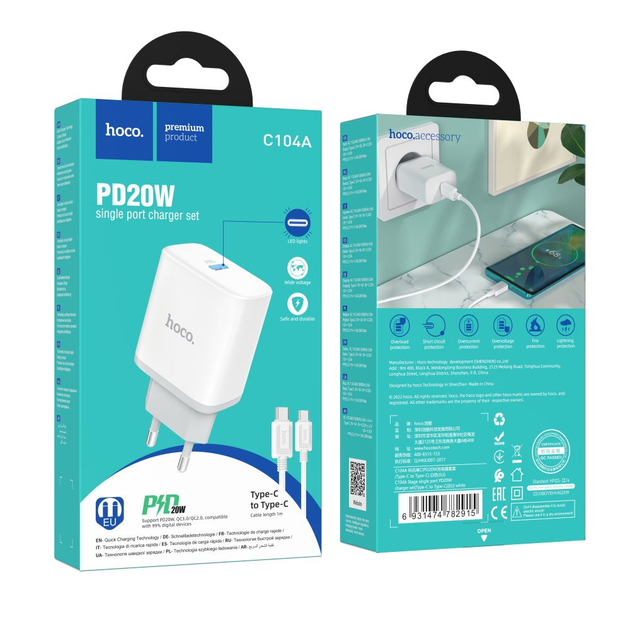 Мережевий зарядний пристрій hoco 20W з підтримкою pd та qc з кабелем type c на type c білий