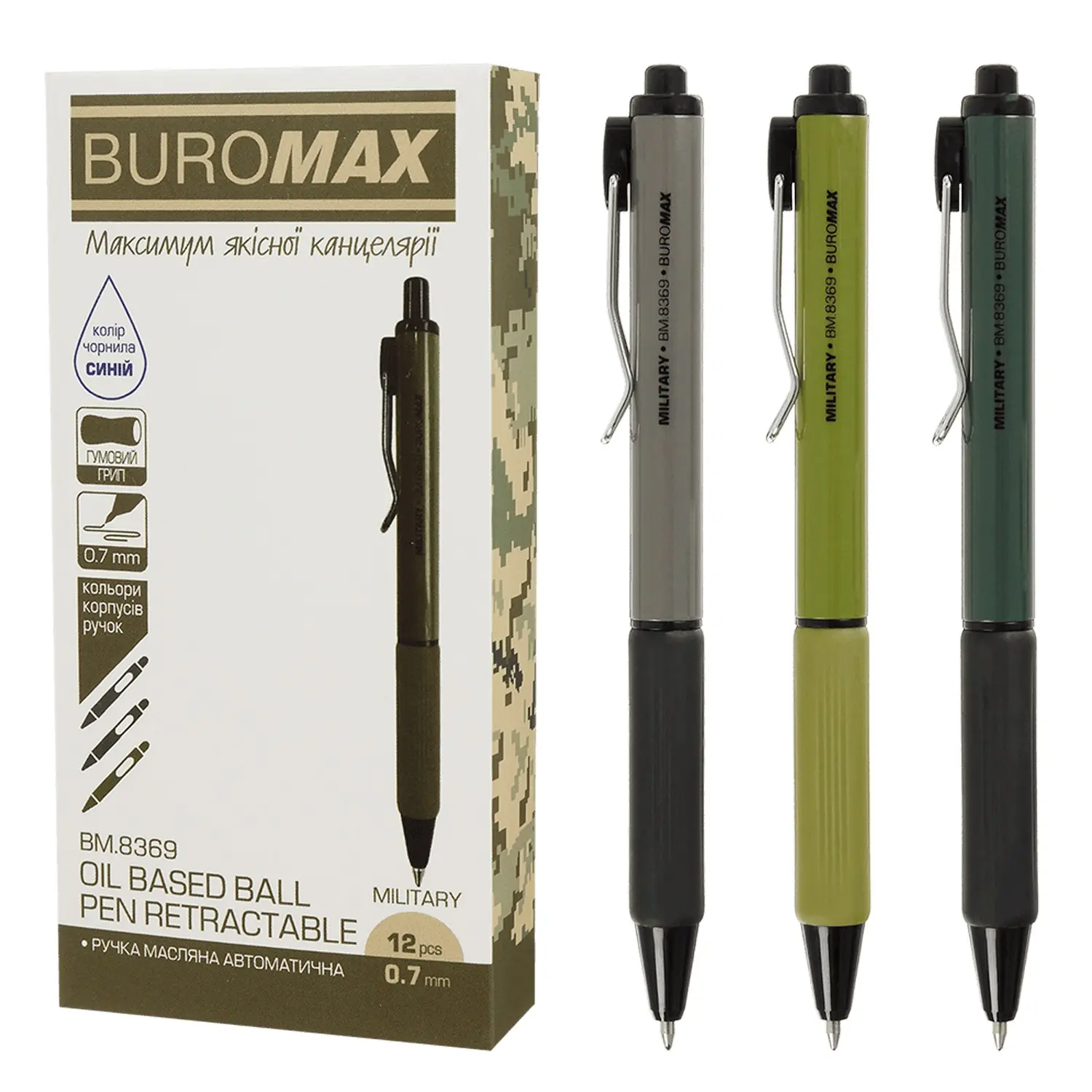 Ручка масляна автоматична Military, 0.7 мм, із гумовим грипом, сині чорнила, 12 шт. (В асортименті)