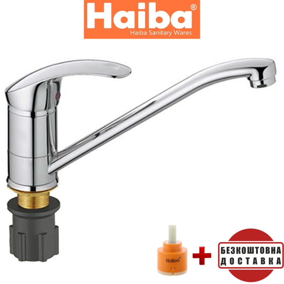 Змішувачі торгової марки HAIBA виготовляються на німецькому обладнанні з латуні найвищої якості. Контроль якості продукції HAIBA здійснюється фахівцями з Німеччини. У виробництві використовуються іспанські картриджі SEDAL та німецькі кран-букси. Латунний картриджний змішувач для кухні з довгим поворотним носом, комплектується гнучким підведенням 45 см, кріплення шпилька. Змішувач