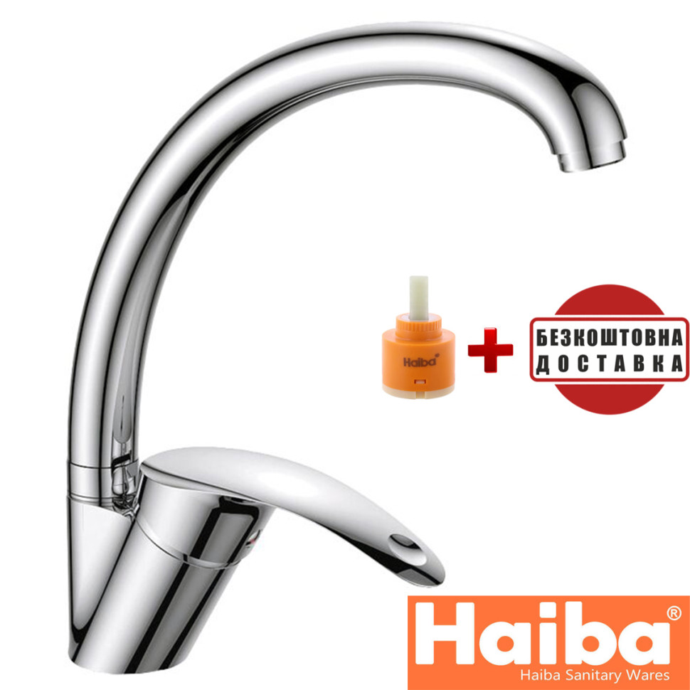 Змішувачі торгової марки HAIBA виготовляються на німецькому обладнанні з латуні найвищої якості. Контроль якості продукції HAIBA здійснюється фахівцями з Німеччини. У виробництві використовуються іспанські картриджі SEDAL та німецькі кран-букси. Латунний картриджний змішувач для кухні з високим поворотним носом, комплектується гнучким підведенням 45 см, кріплення шпилька.