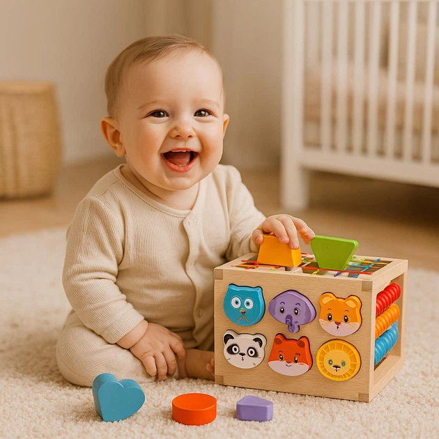 Сортер куб дитячий дерев'яний , геометричні фігури , тваринами, та резиночками, рахівниця (СK61498)