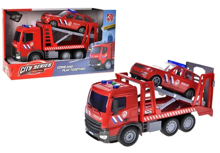 Іграшковий евакуатор на батарейках з пожежною машинкою RuiJia інерційна вантажівка автовоз