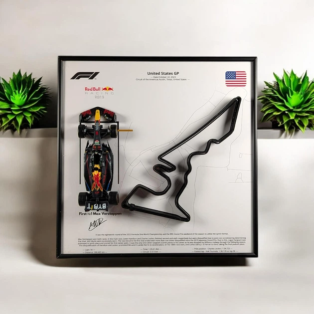 Колекційна Модель Bburago з Рамкою Тримачем 2в1 на Стіну або Полку з Red Bull RACING RB19 (Ліврея) та 3D Трасою USA GP (Circ