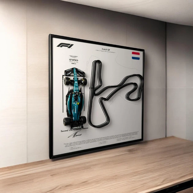 Колекційна Модель Bburago з Рамкою Тримачем 2в1 на Стіну або Полку з F1 Aston Martin Aramco (AMR23) і 3D Трасою Dutch GP "Ci