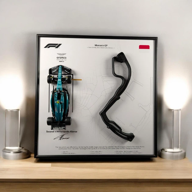 Колекційна Модель Bburago з Рамкою Тримачем 2в1 на Стіну або Полку з F1 Aston Martin Aramco (AMR23) і 3D Трасою Monaco GP "M