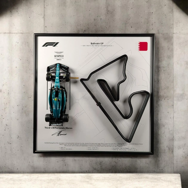 Колекційна Модель Bburago з Рамкою Тримачем 2в1 на Стіну або Полку з F1 Aston Martin Aramco (AMR23) і 3D Трасою Bahrain GP "