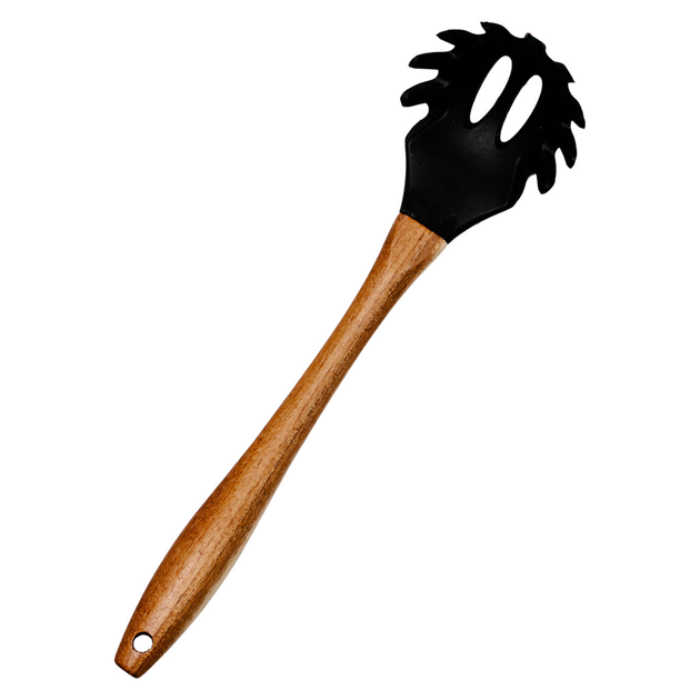 Силіконова ложка для спагетті з дерев'яною ручкою, для антипригарного посуду, чорна