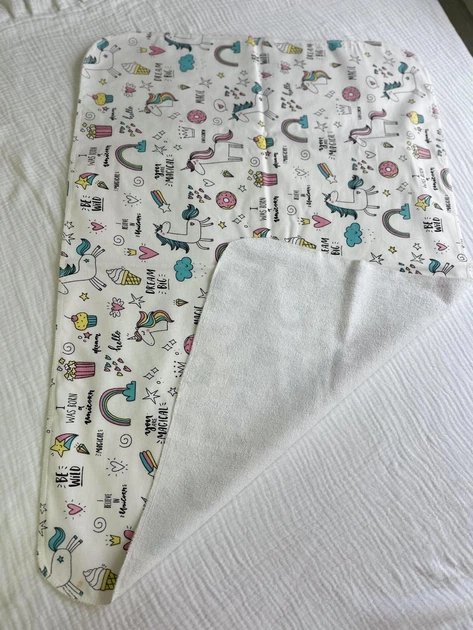 Непромакаєма пелюшка 75*50 см з біла з рожевими єдинорогами