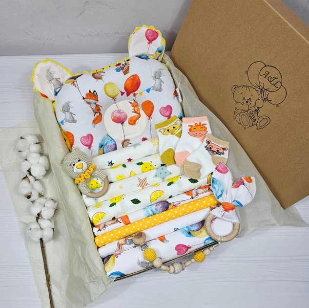 Набір для новонародженого: подушка, пелюшки і іграшки та шкарпеточками a.l.babybox Лисички на кульках