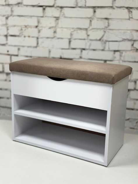 Тумба для взуття з ящиком і м'яким відкривним верхом. Біле ДСП шириною 60 см. Тканина какао