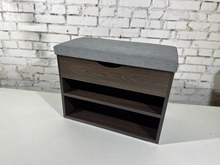 Полиця для взуття в передпокій з ящиком і м'яким відкривним верхом. ДСП графіт шириною 60 см. Тканина - шоколад