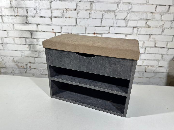 Полиця для взуття в передпокій з ящиком і м'яким відкривним верхом. ДСП графіт шириною 60 см. Тканина - какао