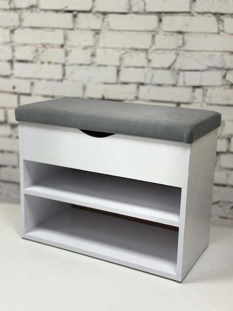 Тумба для взуття з сидінням в білому кольорі шириною 90 см. Тканина в сірому кольорі