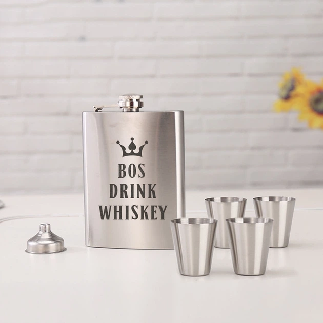 Набір фляга з чарками "Bos drink whiskey", англійська, Дерев'яна подарункова коробка, 210 мл