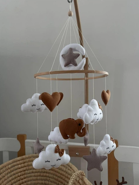 Мобіль в коліску Слоник, хмаринки, серця, місяць, зірки в білих сірих та коричневих кольорах, для хлопчика, для дівчинки, дл
