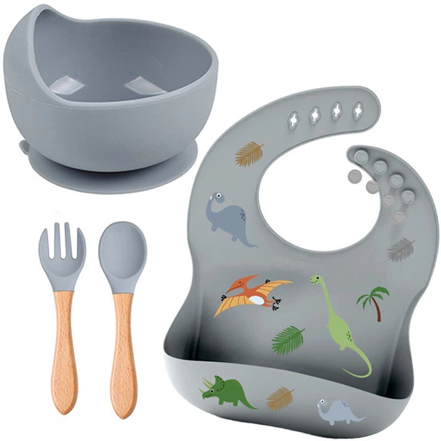 Набір силіконового посуду 2Life Y18 миска для супу дерев'яні прилади та слинявчик з малюнком Сірий n-12863