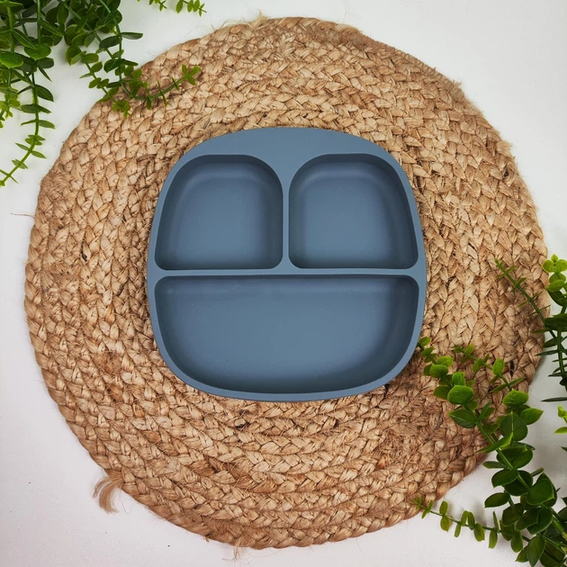 Дитяча силіконова секційна тарілка з кришкою на присосці для першого прикорму, 1 шт. Сіро-блакитний