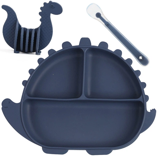 Набір дитячого силіконового посуду 2Life Y10 для першого прикорму з іграшкою-прорізувачем Динозавр Темно-синій n-13395