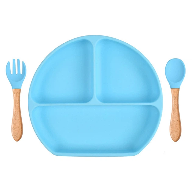 Тарілка силіконова секційна на присосці та прилади з дерев'яною ручкою Блакитна TSK3-Y09