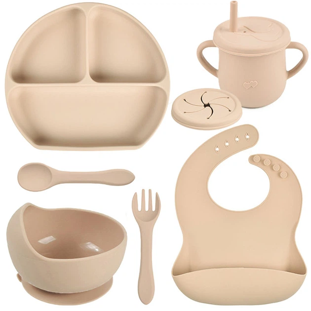 Набір силіконового посуду Y15 трьох-секційна тарілка, поїльник, ложка виделка, слюнявчик Бежевий